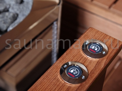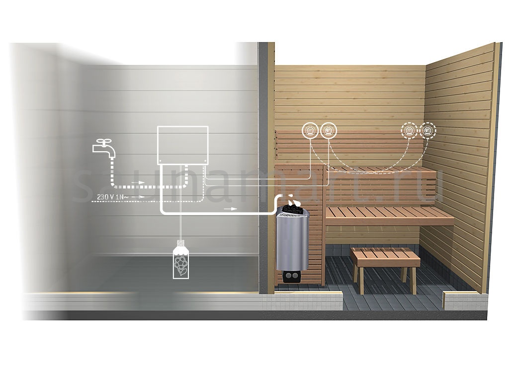 Устройство монтируется в удобном месте парной, обеспечивая комфортное управление парогенерацией. Совместимо с большинством печей Harvia.