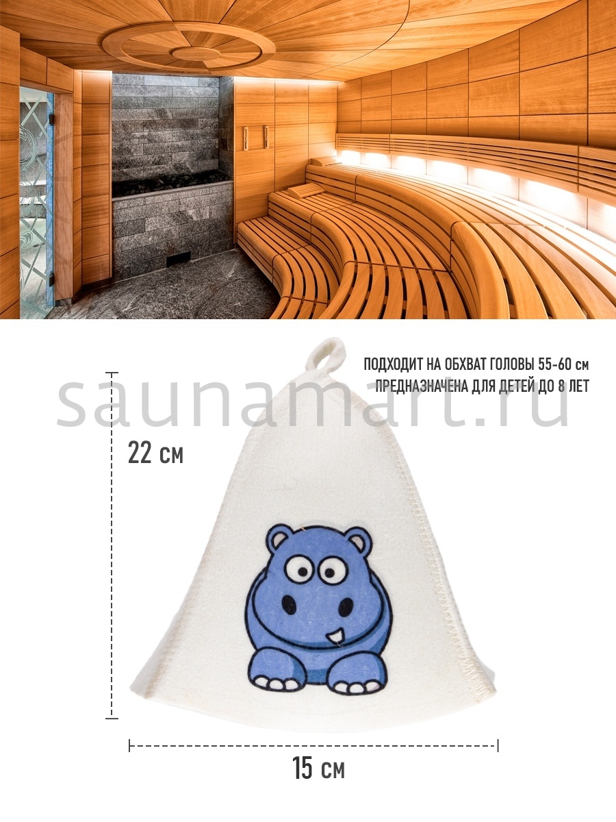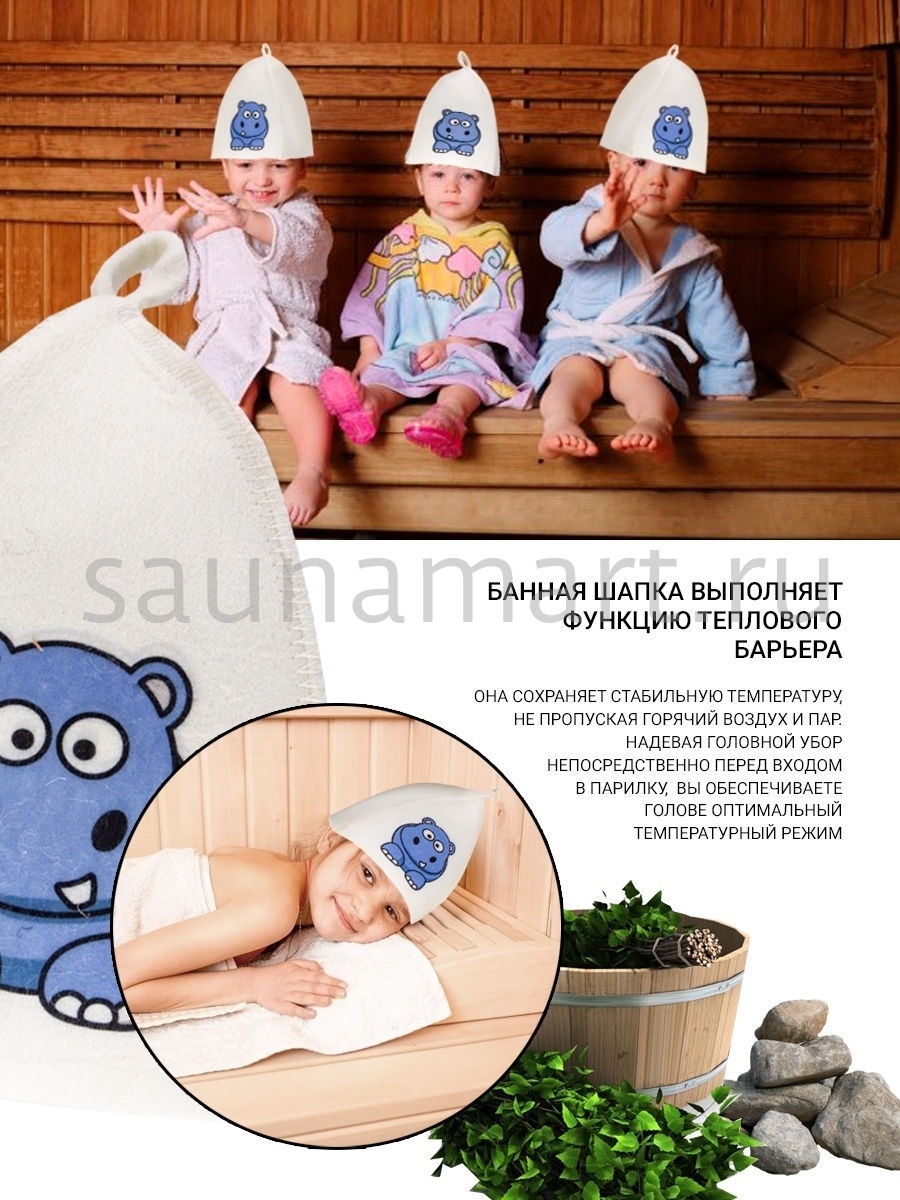 Шапка это необходимый атрибут для похода в баню или сауну – как для взрослых, так и для детей. Высокая температура и сухой воздух в парной могут вызвать перегрев и ожоги кожи головы. Шапка для бани убережет голову, уши и волосы от высокой температуры и перегрева. Если пренебрегать защитой головы с помощью шапочки, то волосы теряют влагу и становятся ломкими и сухими. Помимо термоизоляционных свойств банная шапка обладает отличными гигроскопичными свойствами - прекрасно впитывает влагу и пот, что сделает Ваше пребывание в парной более комфортным. Головной убор для бани выполнен из натурального материала – войлок. Материал достаточно пористый, за счет чего создает своеобразный защитный барьер по принципу термоса, для изоляции от высокой температуры. Яркий рисунок бегемотика обязательно придется по вкусу ребенку. После применения расправьте шапку и просушите. Мы предлагаем Вам не только эффективное средство защиты от перегрева, но и стильный яркий аксессуар для бани и сауны.
