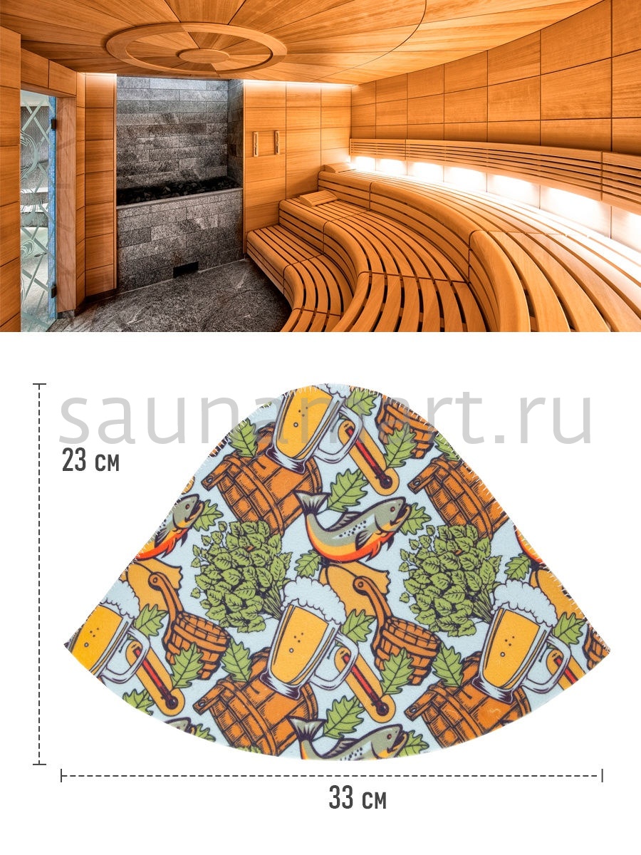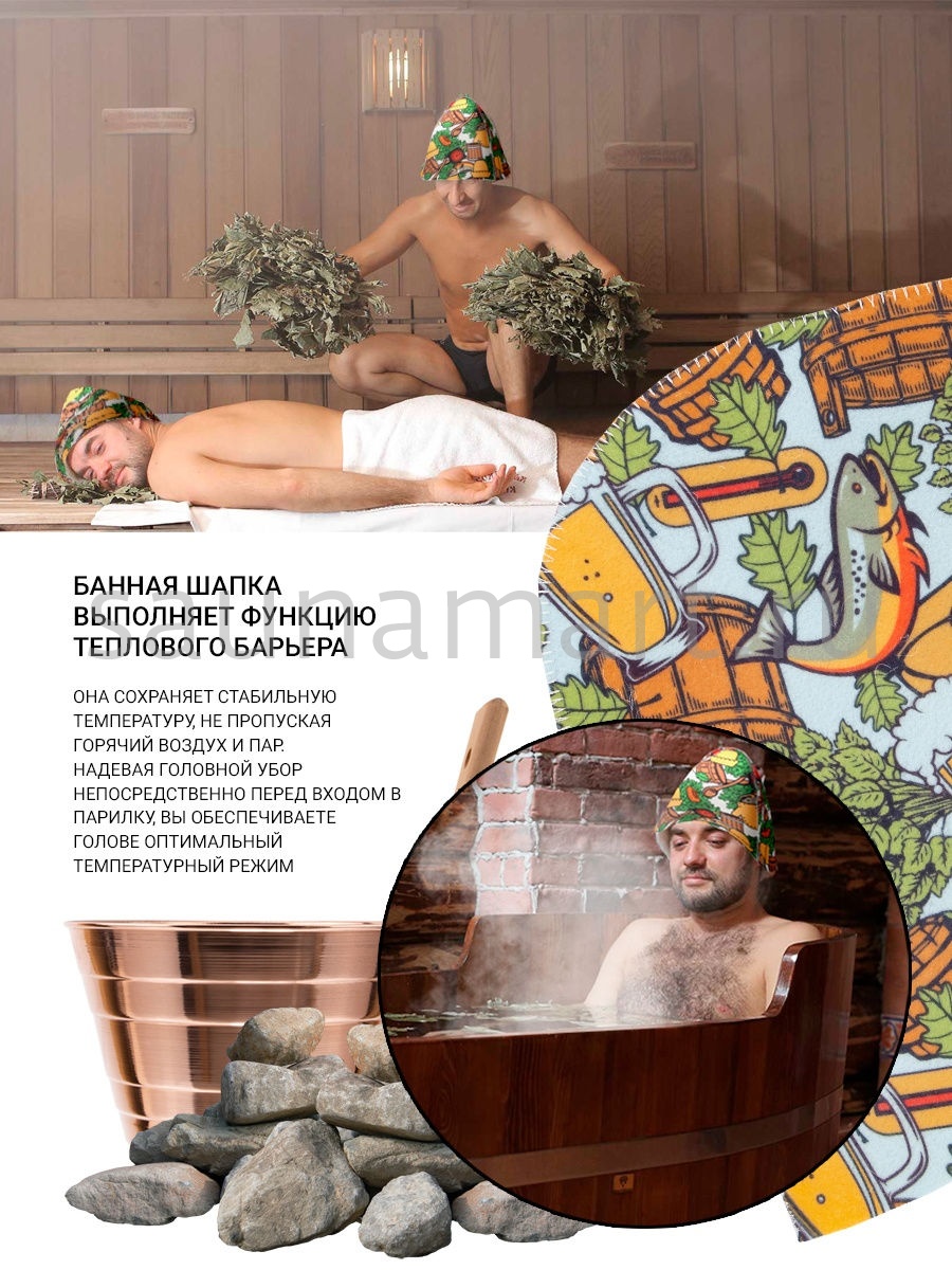 Шапка это необходимый атрибут для похода в баню или сауну. Высокая температура и сухой воздух в парной могут вызвать перегрев и ожоги кожи головы. Шапка для бани убережет голову, уши и волосы от высокой температуры и перегрева. Если пренебрегать защитой головы с помощью шапочки, то волосы теряют влагу и становятся ломкими и сухими. Помимо термоизоляционных свойств банная шапка обладает отличными гигроскопичными свойствами - прекрасно впитывает влагу и пот, что сделает Ваше пребывание в парной более комфортным. Головной убор для бани выполнен из натурального материала – войлок. Материал достаточно пористый, за счет чего создает своеобразный защитный барьер  по принципу термоса, для изоляции от высокой температуры. Стильный, яркий, необычный рисунок выделит Вас и подчеркнет Вашу индивидуальность. После применения расправьте шапку и просушите. Размер универсальный. Мы предлагаем Вам не только эффективное  средство защиты от перегрева, но и стильный яркий аксессуар для бани и сауны.