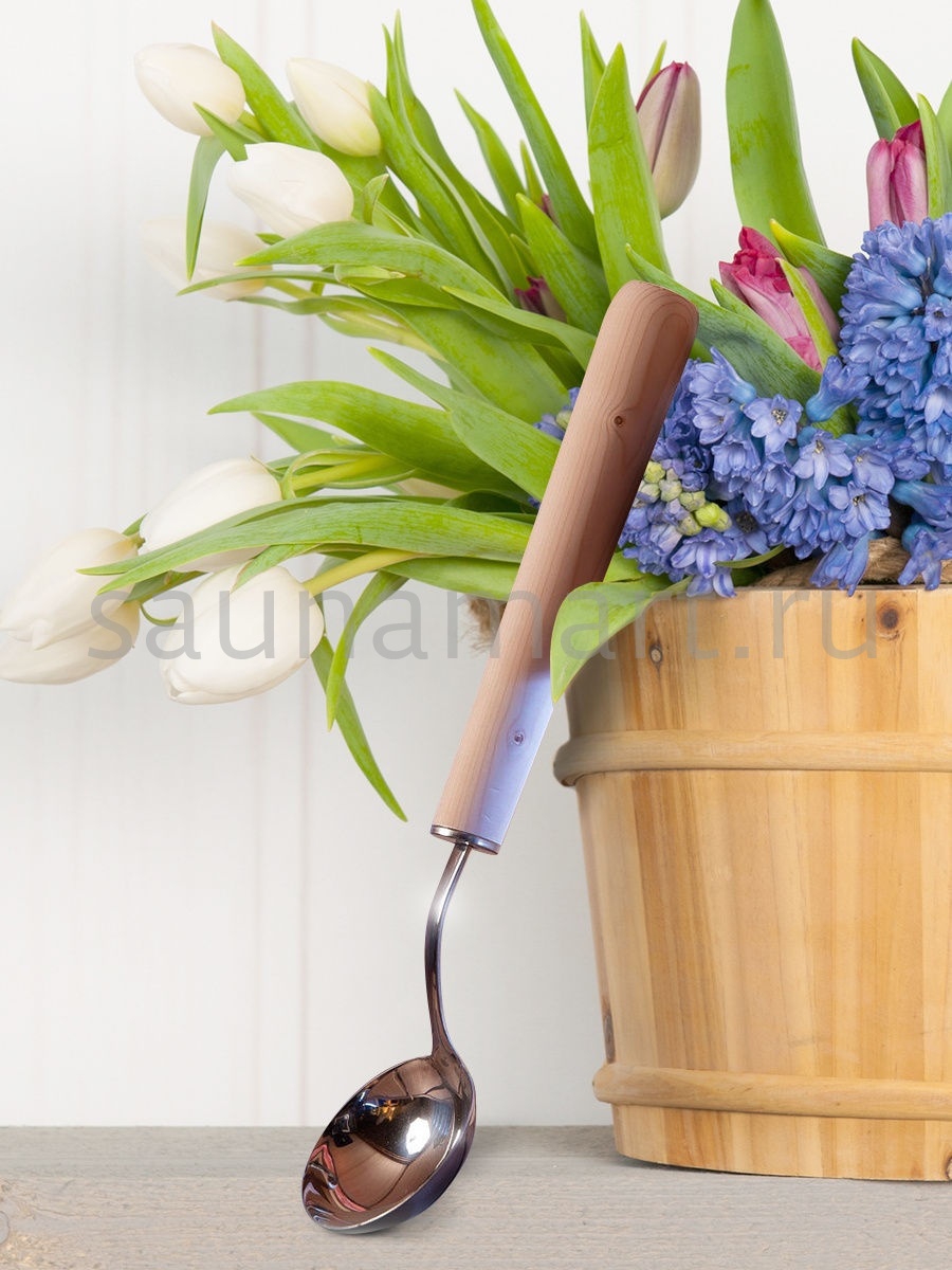 Практичный и долговечный металлический ковш с ручкой из натуральной древесины, обладающей низкой теплопроводностью, которая надежно оберегает ваши руки от ожогов.