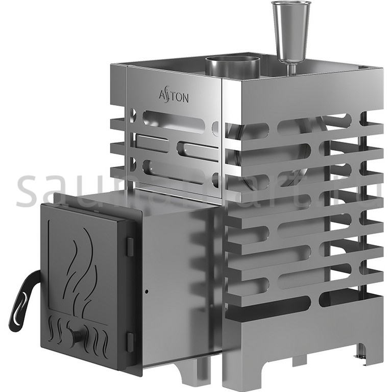 Стеклянная или глухая дверки помогают обслуживать топку и регулировать скорость горения топлива в печи. Линейка печей ASTON из нержавеющей стали рассчитана на установку в парные объёмом от 6 до 22 м?.
