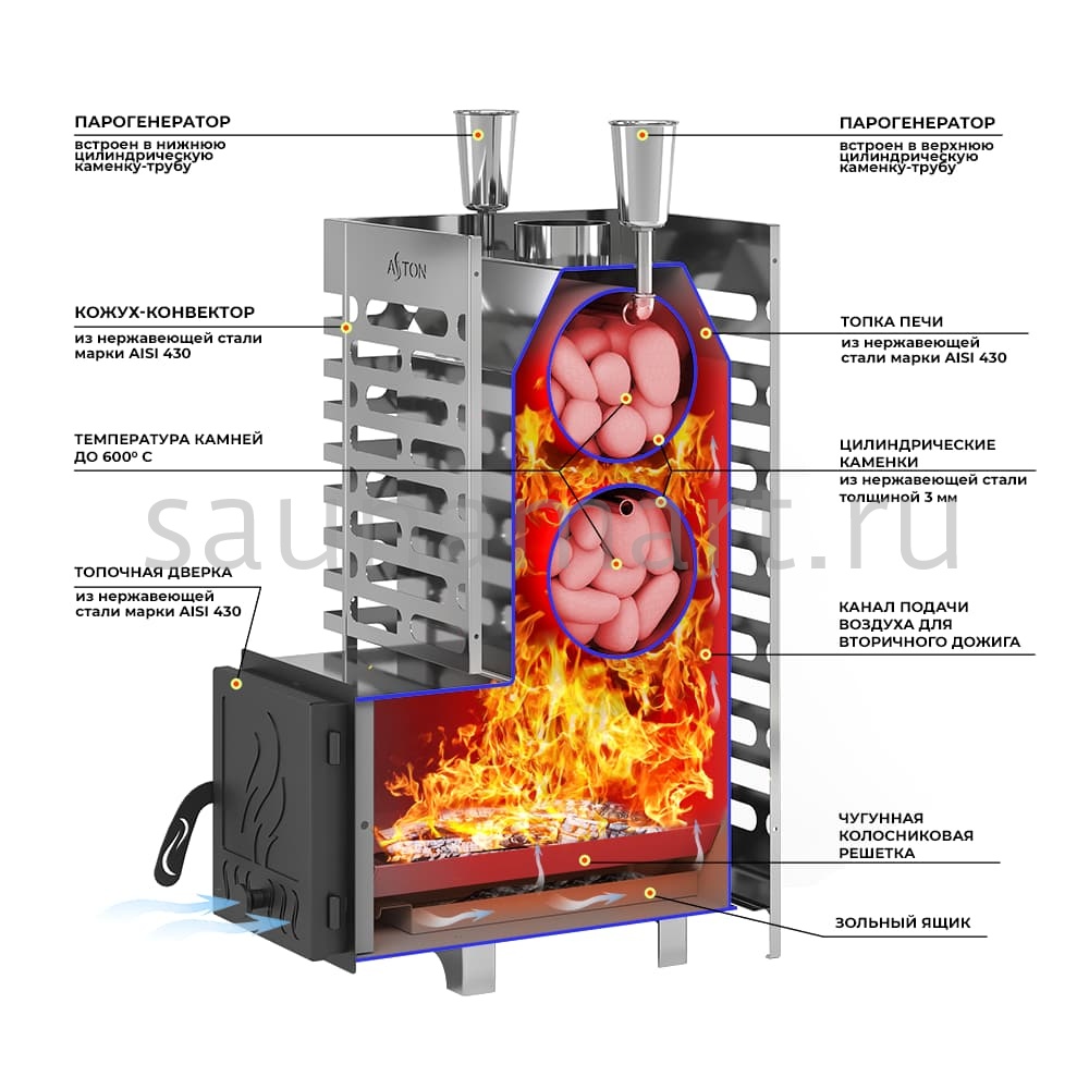 Преимущество печей ASTON: Конструкция разработана для максимальной тепловой эффективности при минимальном расходе ресурсов - времени и топлива. Каменка и корпус имеют скошенные поверхности, что обеспечивает свободное движение дымовых газов без образования "дымовых карманов". Такая геометрия позволяет всем частям печи прогреваться равномерно как по температуре, так и по времени, обеспечивая полное сгорание топлива и быстрый результат.