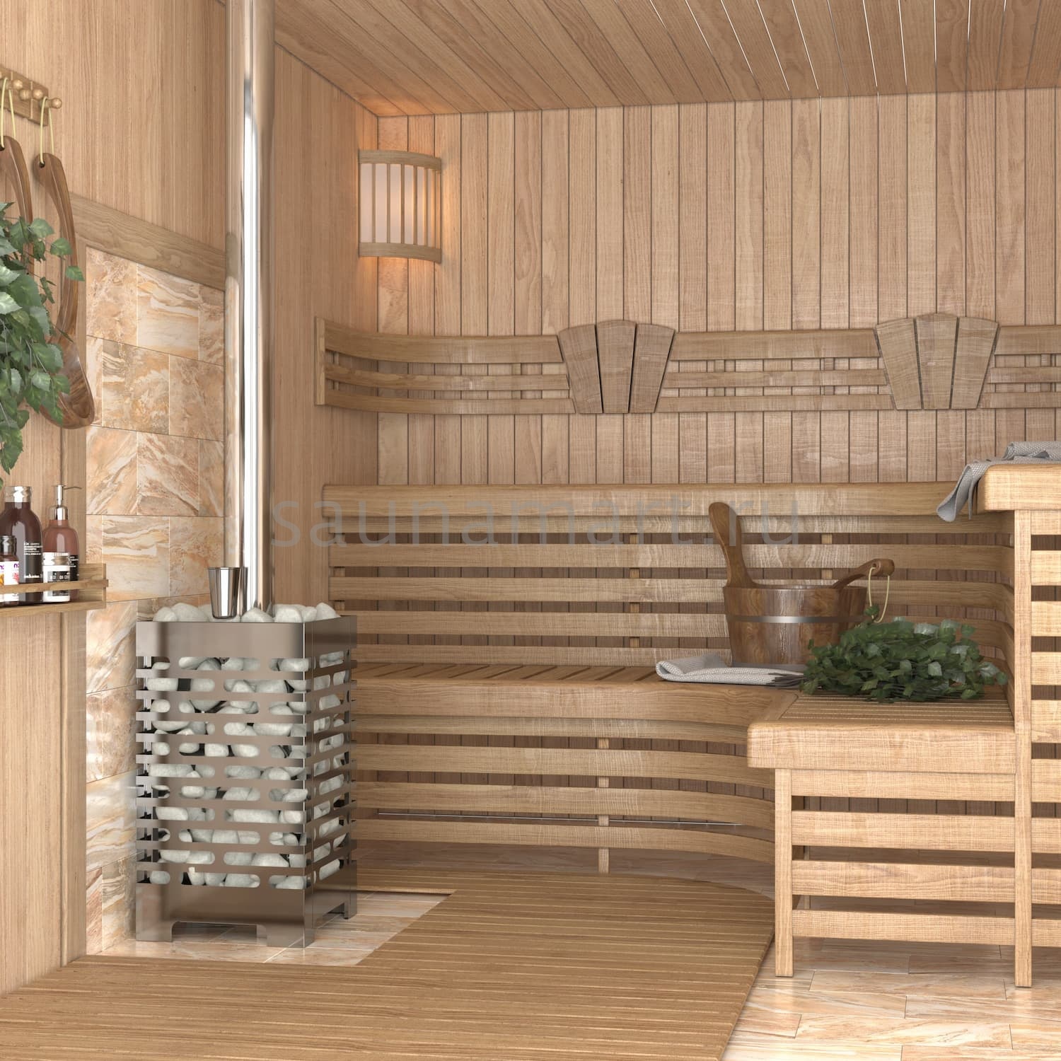 Стальной кожух открытой каменки вмещает в себя до 160 килограммов банного камня.