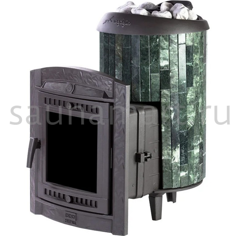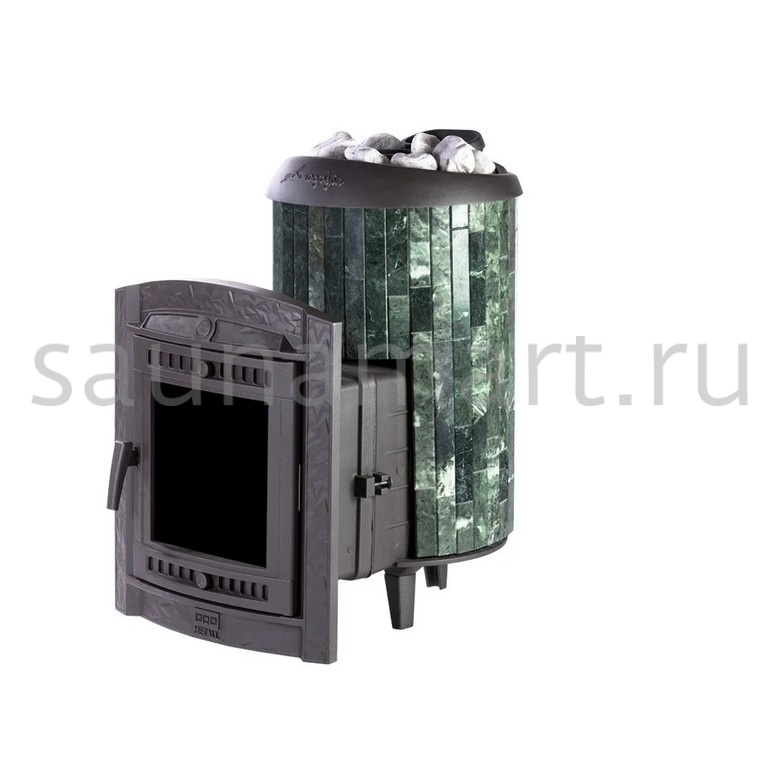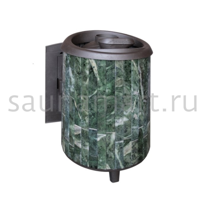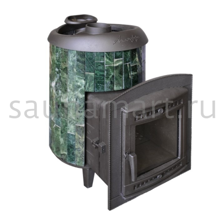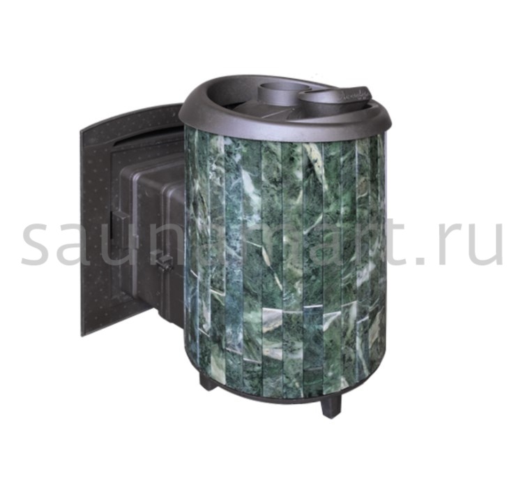 Практичная и компактная модель. Ламели из змеевика, расположенные по периметру внешней каменки, не только обладают отличными теплонакопительными свойствами, но и придают печи уникальный внешний вид.
