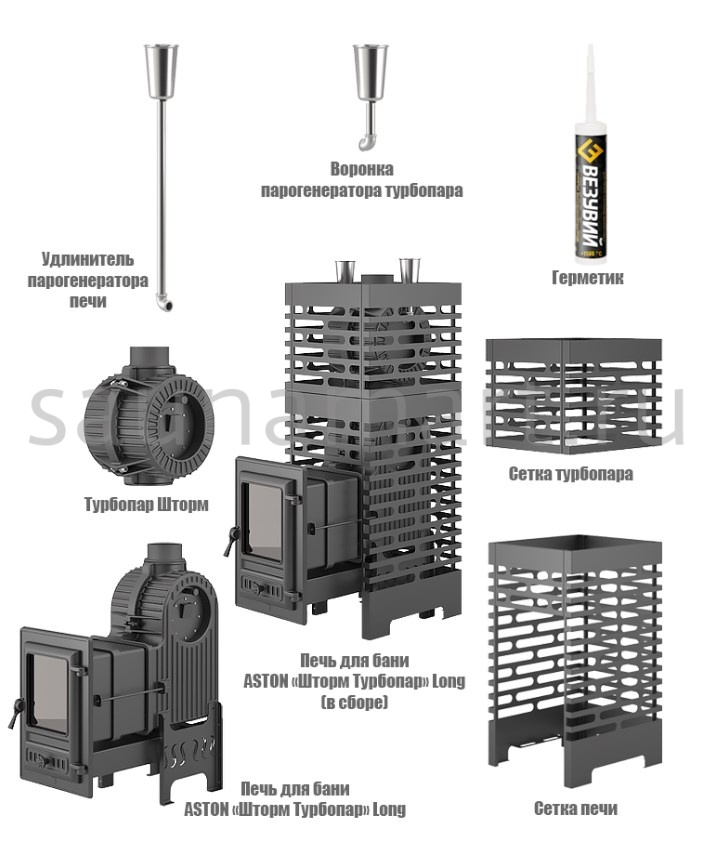 Комплект состоит из чугунной банной печи Астон Шторм 18 и чугунной натрубной каменки Турбопар. Объединение двух конструкций в единую систему заметно увеличивает тепловую отдачу термоагрегата, предотвращает перегрев дымохода, организует дополнительную каменку для получения качественного пара.
