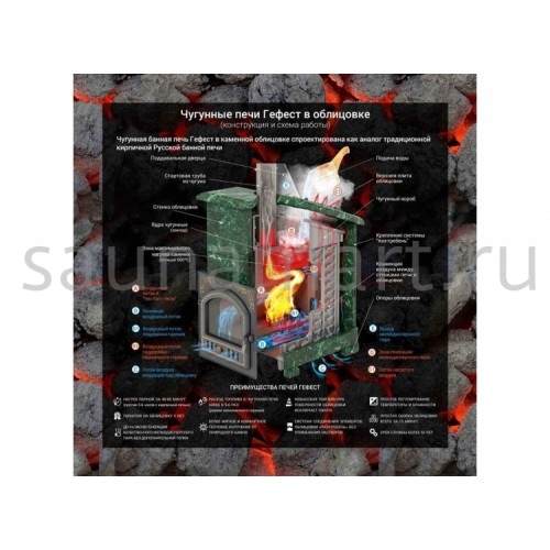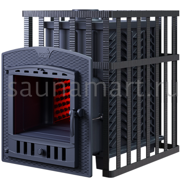 GFS ЗК 30 (П2) в сетке - печь с усиленной каменкой большей массы, с единым углублением внутрь топки для дополнительной укладки чугунного заряда. Теплосъемные шипы, со стороны горения пламени, в разы увеличивают площадь соприкосновения огня с каменкой и ускоряют передачу тепла, а также способствуют лучшему дожигу, смешивая потоки пламени и воздуха, поступаемого из воздушника. Эти усовершенствования значительно повышают мощность парообразования печи и выдают большее количество пара при непрерывной подаче воды. Каменка печей GFS-ЗК является незаливаемой.