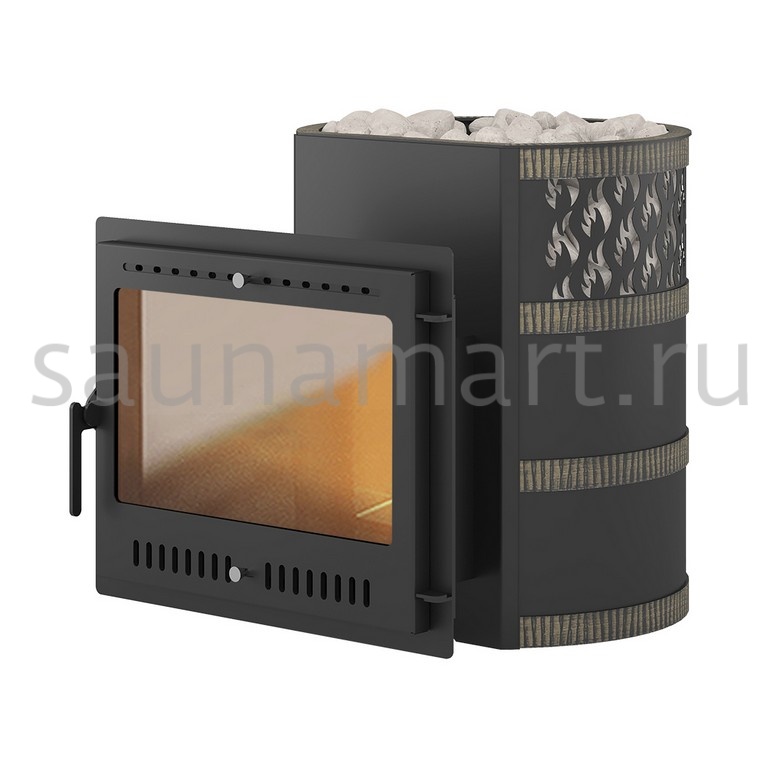 Кожух из стального листа и кованых стальных колец предназначен для обеспечения конвекции устройства открытой каменки и дополнительно защищает парящихся от жёсткого инфракрасного излучения. В верхней части кожуха для усиления движения воздуха сделаны прорезные отверстия в виде языков пламени. Чугунные детали - колосник и пламегаситель, не меняют своей геометрии во время топки, хорошо противостоят высокой температуре. Зольный ящик совкового типа отлично подходит для уборки печи и удаления золы. Чугунный пламегаситель является съёмным элементом, что облегчает прочистку печи. В то же время, пламегаситель зафиксирован от продольного перемещения, что является гарантией единственно правильного положения элемента в печи. В печи обеспечена возможность горения дров в тоннеле. Тоннель выполнен из стали 4 мм, а дно тоннеля расположено на одном уровне с дном топки для беспрепятственного перемещения углей в глубь топки.