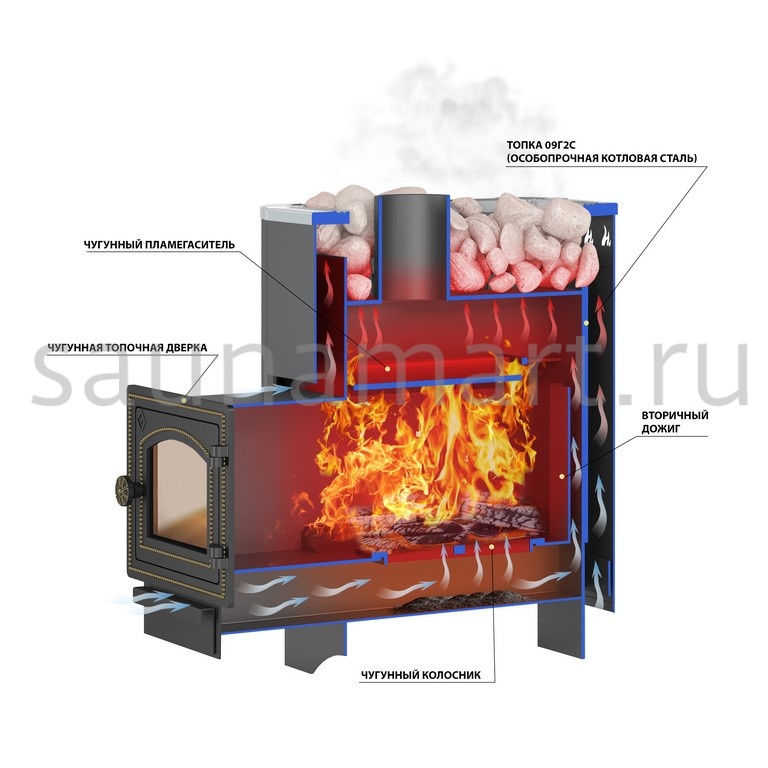 Канал для подачи вторичного дожига расположен на задней поверхности топки и проходит снизу, из поддувала, вверх, в дымосборник. Он существенно усиливает горение в верхней части печи и повышает количество получаемого от топлива энергии. Стальной кожух печи зафиксирован на корпусе, для улучшения конвекции оснащён прорезными отверстиями в верхней части. Внутренние вырезы обеспечивают попадание холодного воздуха к камням, наружные – нагрев воздуха в парной.