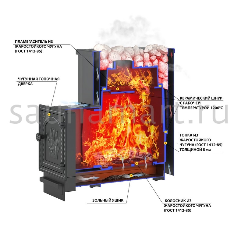 Преимущество печи в том, что топка печи состоит из 3-х элементов. На стыке между ними используется керамический шнур с рабочей температурой 1200 градусов. То есть топка печи абсолютно герметична! Для фиксации деталей между собой применяется болтовое соединение, что даёт 100% гарантию безопасности при эксплуатации.