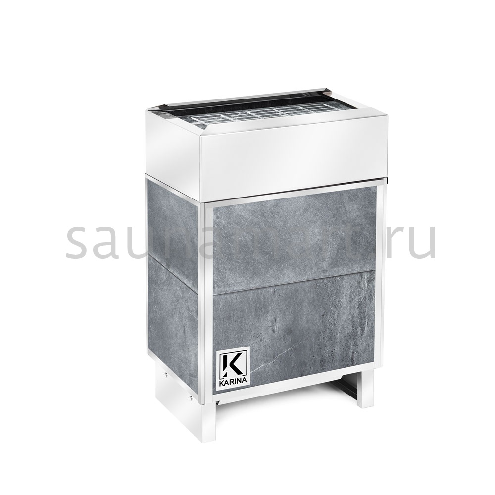 Электрокаменка подключается к сети с напряжением 220 В. Печь KARINA Elite не укомплектовывается выносным пультом, его нужно будет приобрести дополнительно.