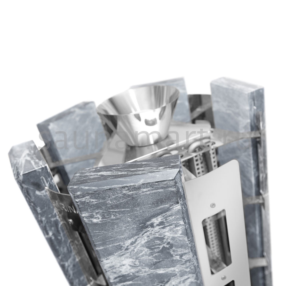 Все корпусные элементы печи выполнены из нержавеющей стали. Нагревательный элемент - ТЭН диаметром 10мм. Наружный кожух каменки дополнительно облицован плитами из Змеевика толщиной 40мм, что придает ей еще большую теплоемкость и меньшее излучение от металлических элементов, которые выжигают воздух в парной. Общий вес камней составляет 160кг (загрузка печи 100кг и вес облицовки 60кг). Вес камней сопоставим с закладкой в хорошую дровяную печь, тем самым с помощью парогенератора, закрытой каменки и закладки камня в 160 кг, легко достигается режим настоящей русской бани.