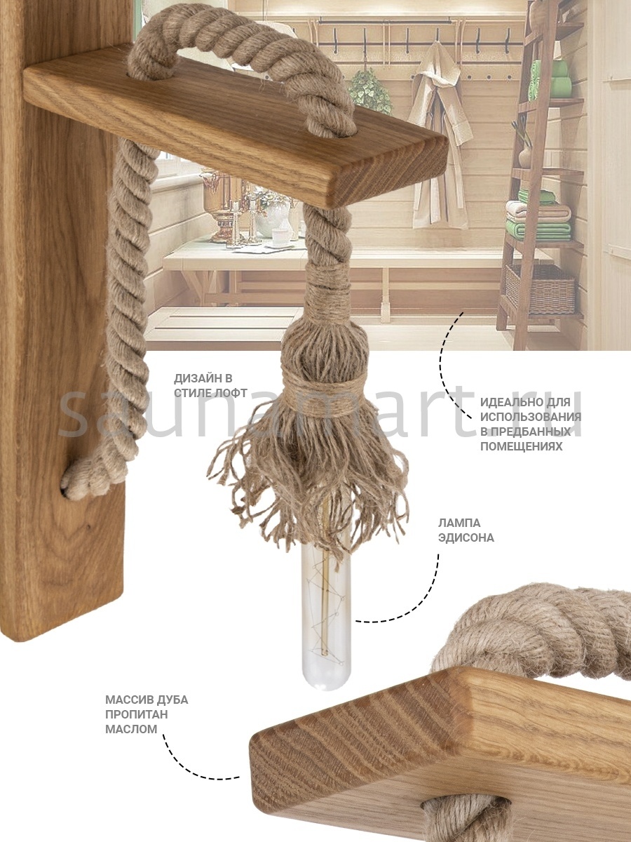Эко-дизайн, стиль и качество исполнения данного аксессуара не оставят равнодушным ни одного ценителя изделий из древесины. Для производства светильника мы отбираем только ценную, благородную породу Кавказского дуба премиального качества. Пропитываем древесину маслом с добавлением воска. При производстве дерево проходит все необходимые этапы сушки и обработки. Сборка светильника производится вручную. Мы гарантируем, что Вы приобретаете изделие, соответствующее мировым стандартам качества. Светильник Лофт предназначен для создания уютной, теплой, расслабляющей атмосферы в комнате отдыха. Аксессуар может использоваться для стилизации ванной, любой другой комнаты в квартире или промышленном дизайне -бары, рестораны и т.д. В комплекте со светильником поставляется лампа Эдисона в стиле Лофт 28х185мм, 60 Вт. Размер светильника в сборе: 24 х 41 х 8 см. Эсклюзивный дизайн светильника можно поддержать другими аксессуарами-компаньонами из коллекции: полкой арт. 21095469, вешалкой арт. 21100169.